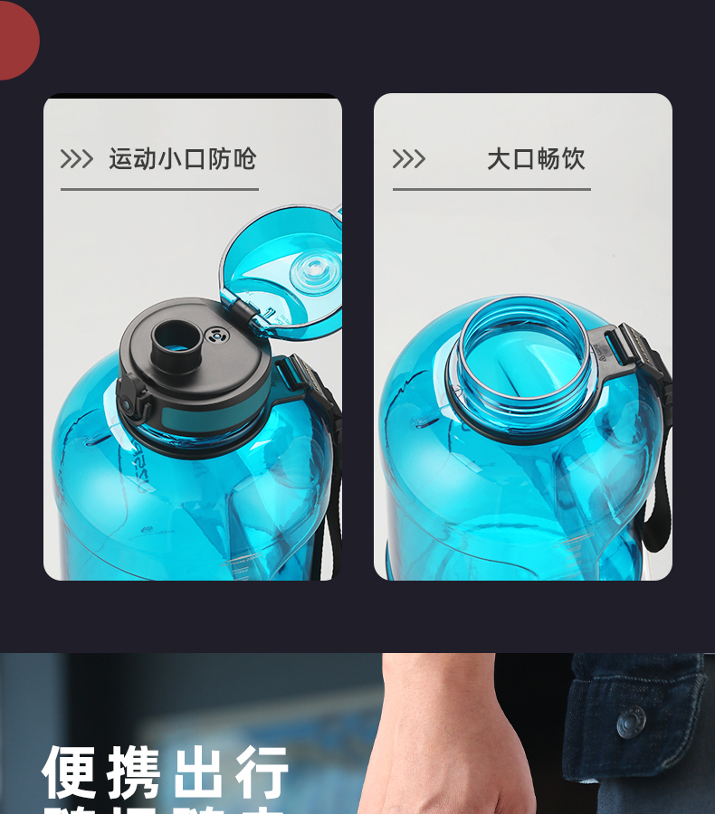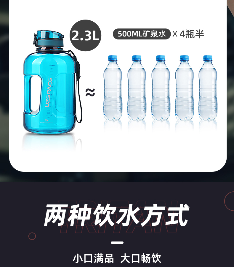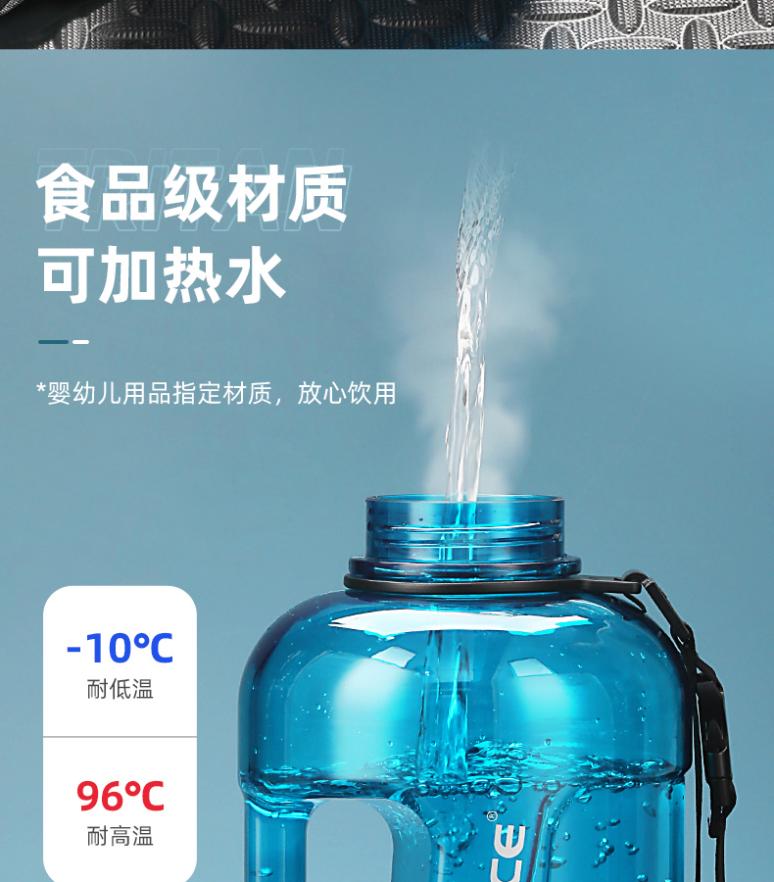 (2)清晰刻度标识:瓶身上有水量刻度,能够清晰地显示剩余水量或已饮水量,方便人们科学补水,合理安排饮水计划,以满足身体在不同情况下的水分需求。